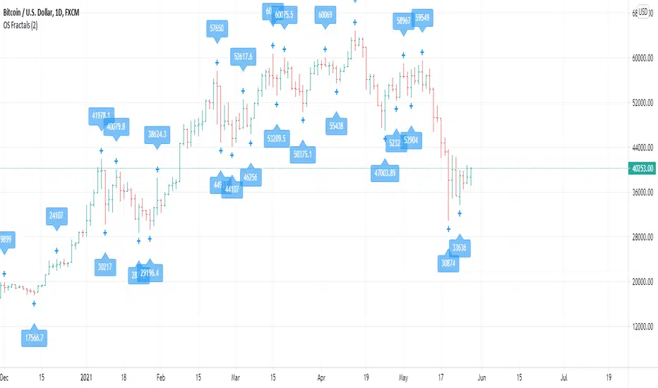 Bill Williams uses a period of 2 (2 after and 2 before) to define a fractal. This indicator has 2 as default but lets you decide the range you want.