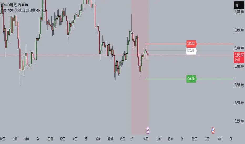 The Fractal Time Grid is a Pine-Script v5 TradingView indicator designed to automate session-based entries, stops, and targets. It overlays on your chart, shading trading “quarters” of any chosen timezone, highlighting bullish or bearish bias zones, and marking up to N entries per quarter with on-chart signals. Optional SL/TP rays and built-in alerts make it a one-stop tool for disciplined session trading.