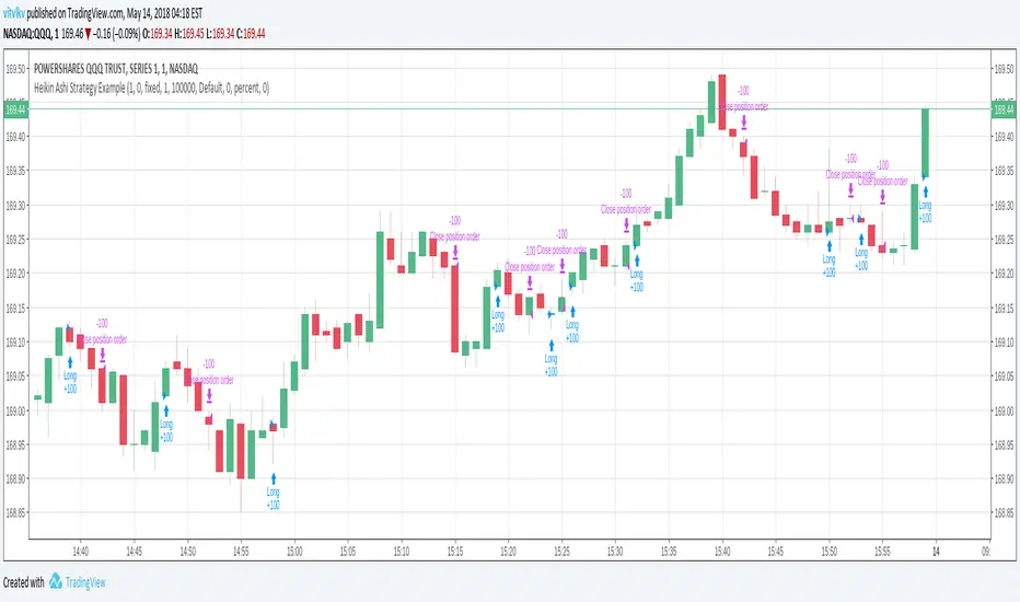 A strategy which calculates it's entry/exit conditions using HeikinAshi prices and executes orders using real prices (usual candles). NOTE that strategy should be added on a usual candles chart. Heikin Ashi prices are requested in the Pine code using 'security' function.
