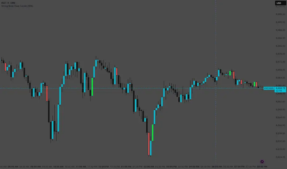 This indicator highlights Strong Body Close Candles, which are single bars where the real body makes up the vast majority of the total range and the close is positioned very close to the candle’s extreme. By default, the script looks for candles where the body is at least 90% of the full high-low range, and the close falls within the top 10% (for bullish) or bottom 10% (for bearish). These settings ensure that only very strong, conviction-driven candles are marked. The script plots labels above or below qualifying bars, colors the candle accordingly, and provides alert conditions so you can be notified in real time when such a candle forms.