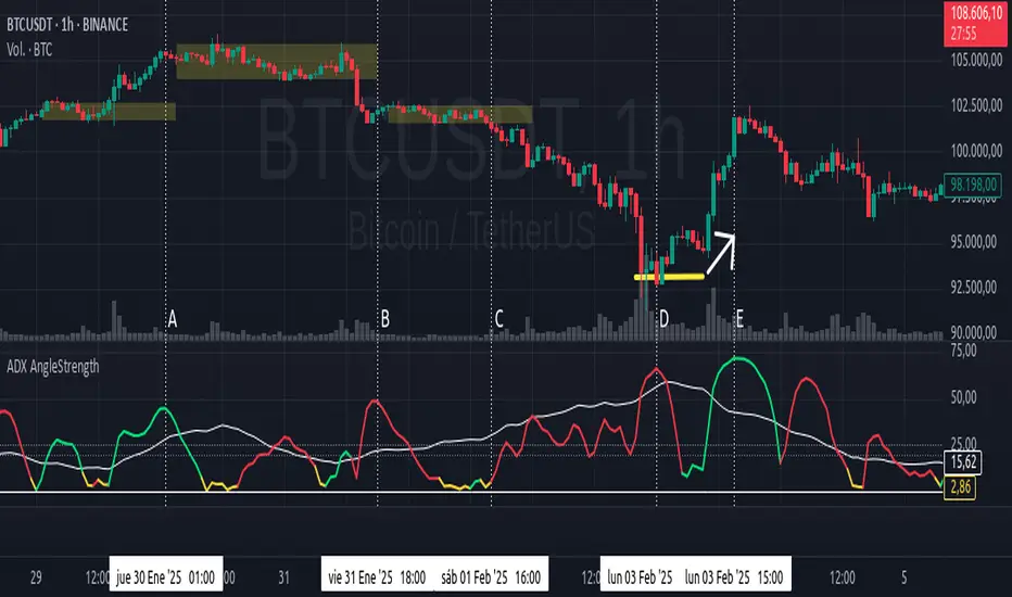 This script merges the power of the traditional ADX with a visual interpretation of the angular slope of a moving average, offering a highly effective tool to identify real impulses in price action. The goal of the indicator is not only to highlight market strength, but to reveal direction and slope —helping traders spot the end of impulses, consolidation zones, and potential reversal points.