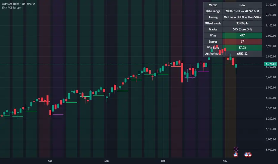 Inspired by the book “The Slick Strategy: A Unique Profitable Options Trading Method.” This indicator tests weekly SPX put-credit spreads set below Monday’s open and judged at Friday’s close.