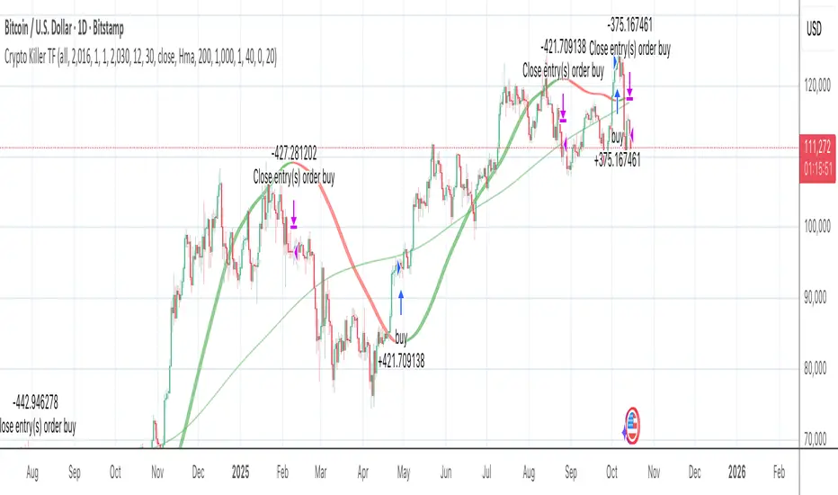 Crypto Killer - Dual trend confirmation strategy. Uses a fast trend line for signals and a slow trend line as a filter. Only enters long or short when both agree, which cuts out fake breakouts and keeps you in real moves.