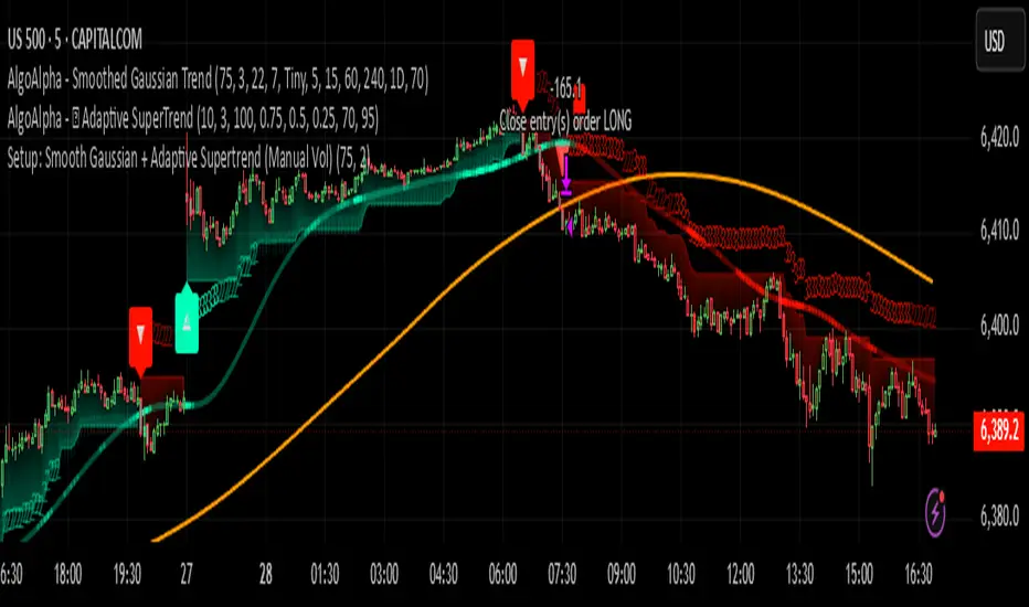 This strategy does not connect to the actual Adaptive Supertrend from Algo Alpha. Users must manually input the volatility level based on what they observe on the chart when the original indicator is also applied. The Smooth Gaussian Trend is approximated and may differ slightly from the original.