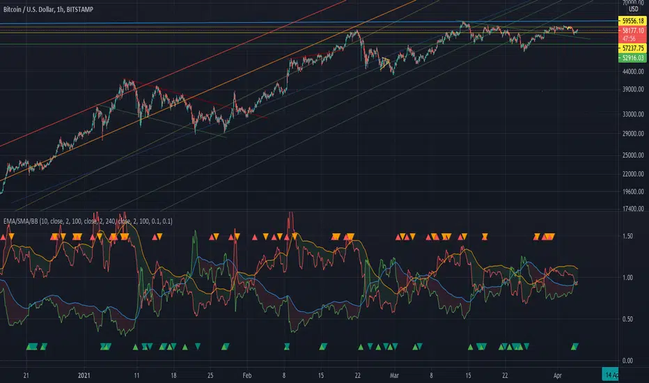 This indicator uses a combination of extension from moving averages, and price volatility on different time scales to give buy and sell signals based upon your preferred risk tolerance. Increasing the buy and sell basis will reduce the chances of false signals, in addition for more advanced users the length of the Bollinger Bands, SMA's, and EMA's used can each be individually adjusted. It is setup for 1 or 2 hour time frames, and when using it on different time scales, it will need to be adjusted.