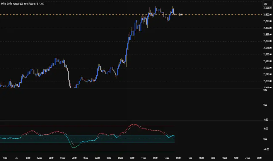 The indicator uses a zero-centered momentum model with dynamic smoothing and clearly defined zones to help traders identify exhaustion, pullbacks, and momentum shifts without excessive noise.