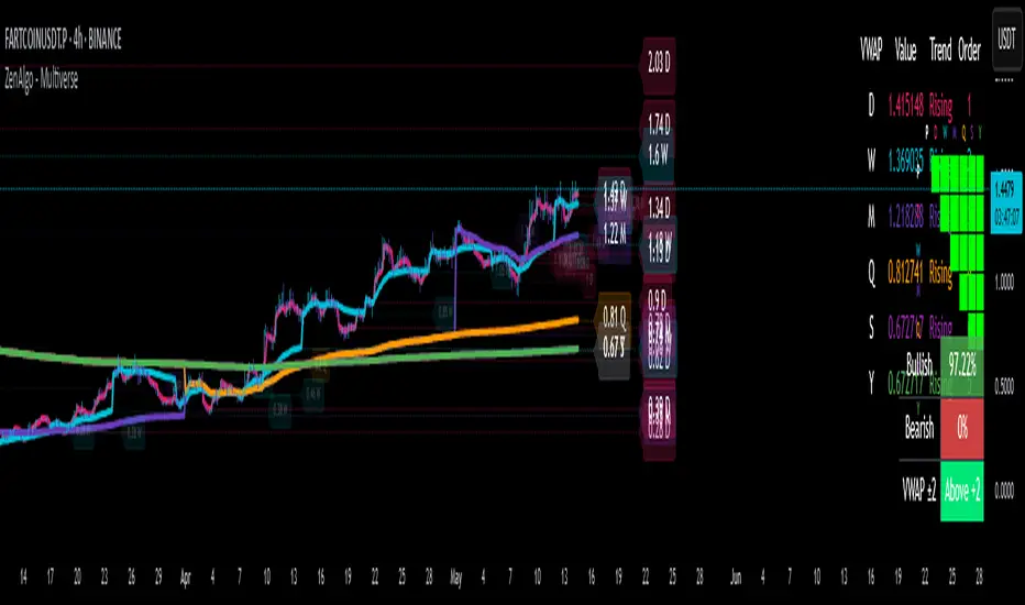 For the Daily VWAP specifically, the script includes an extra classification system. It assigns the current price to a zone (e.g., "At VWAP", "Bear Band", "Above Bull Band 2") based on where the price lies in relation to the VWAP bands. This classification is also used for dynamic coloring and added to the daily label.