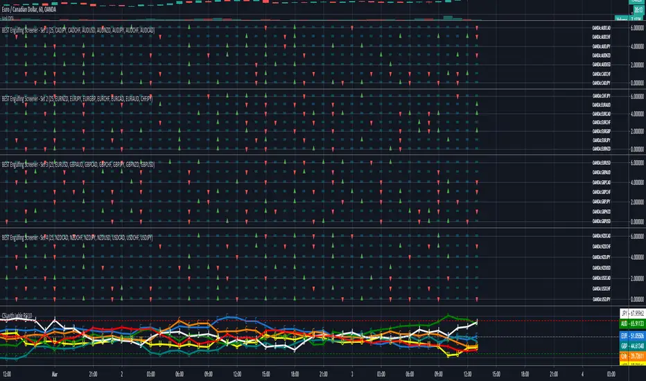 Once all four scripts are added to a chart, you find the UP and DOWN arrows, which represent a bullish or bearish engulfing . Look at the bearish candles, and compare to CSM to see if it is in line with Red and Green. If EURUSD has an UP arrow, and you CSM shows EUR is green and USD is red, it is a valid candle. Then open that chart and see if there is a valid entry based on the price action.
