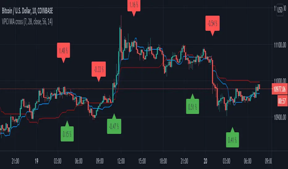 I have used MA's on top of VPCI and looking for crosses. Percatage that is shown in label is calculation of difference between previous cross and current close price. So you know if you would be flipping what % you would gain or loose, all is rounded with precission of two