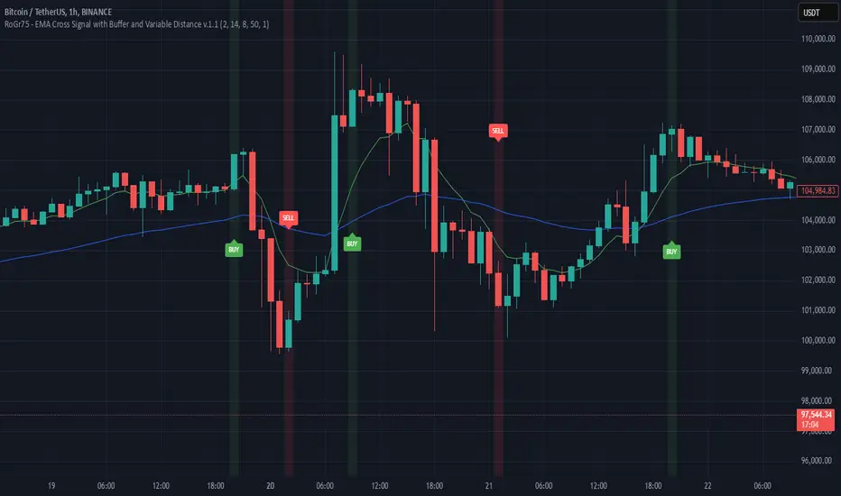 ### **Indicator Description: RoGr75 - EMA Cross Signal with Buffer and Variable Distance v.1.1**This TradingView indicator, "RoGr75 - EMA Cross Signal with Buffer and Variable Distance v.1.1," is designed to generate buy and sell signals based on the crossover of two Exponential Moving Averages (EMAs) with an added buffer for more robust signal generation. The indicator incorporates features such as adjustable signal distance, Average True Range (ATR)-based positioning, background highlighting, and customizable alerts. Below is a detailed explanation of its functionality, features, and important warnings.