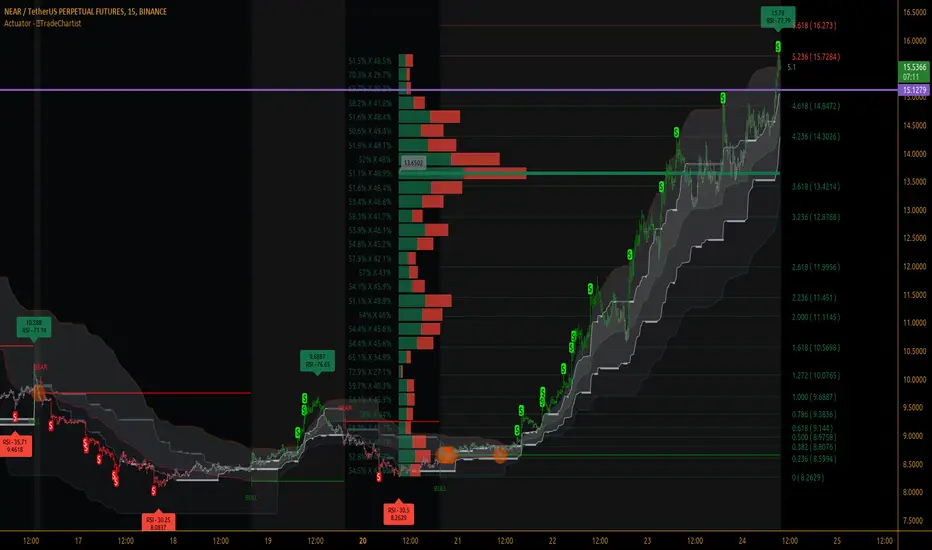 Reference zone for stop loss has always been a tricky one for traders. Using a fixed percentage stop at entry may not be best during high volatility moves. Over the extensive period of Actuator testing, a simple solution to this problem was found. The previous trend's Range Bands Mean Line served as a perfect reference point for Entry Stop. Also while analysing this Mean line, it was found to be a perfect horizontal support/resistance line and also helped detect unproductive trades. The example 15m chart of