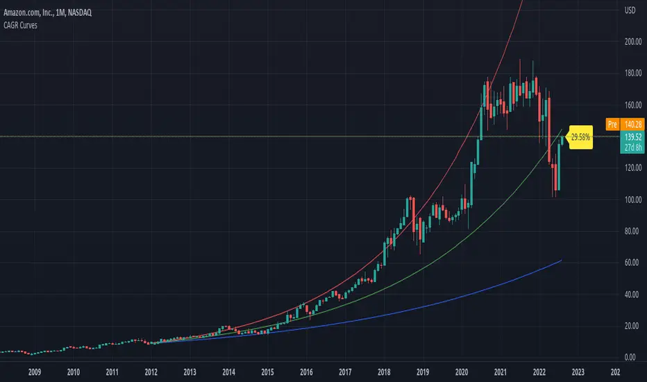 Plots CAGR lines for a given set of rates from a specified time. It will be helpful to see how the rate of growth of a security's price is changing over a period of time. It also calculates the current CAGR from the time specified. Works on D, W, M timeframes.
