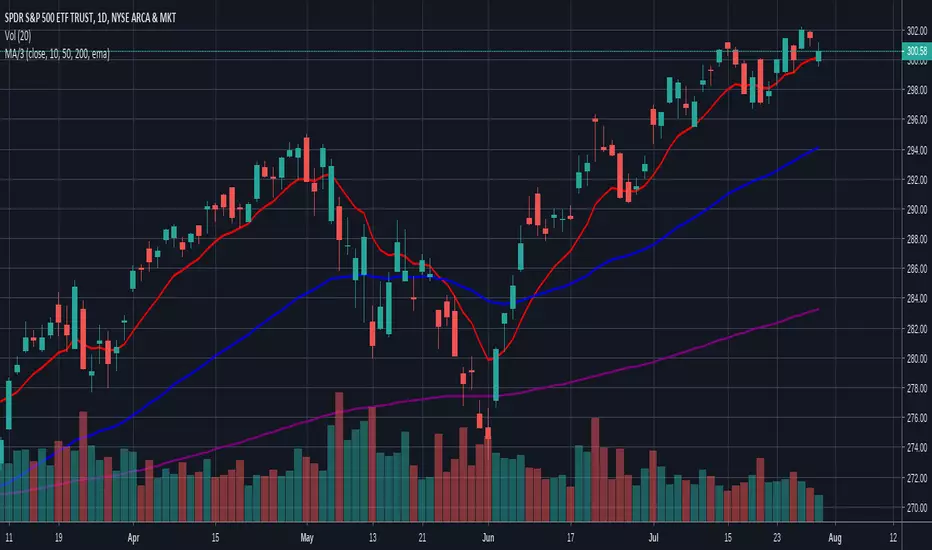 Simple indicator combining up to three moving averages. Uses simple moving average (SMA) and exponential moving average (EMA).