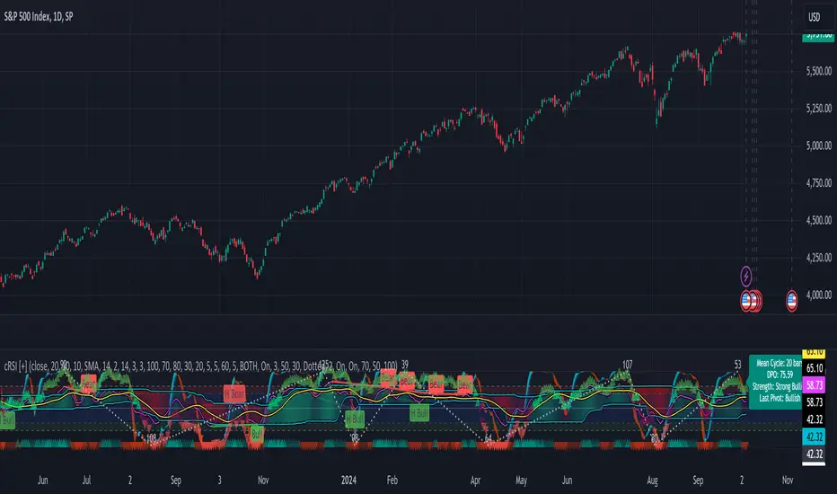 Gabriel's Cyclic Smoothed RSI [Enhanced] (short title: cRSI [+]) is a sophisticated technical indicator developed to provide traders with deeper insights into market rhythms and price momentum. Building upon the traditional Relative Strength Index (RSI), this enhanced version incorporates dynamic cycle analysis, divergence detection, and optional stochastic oscillators to deliver a more nuanced understanding of market conditions.