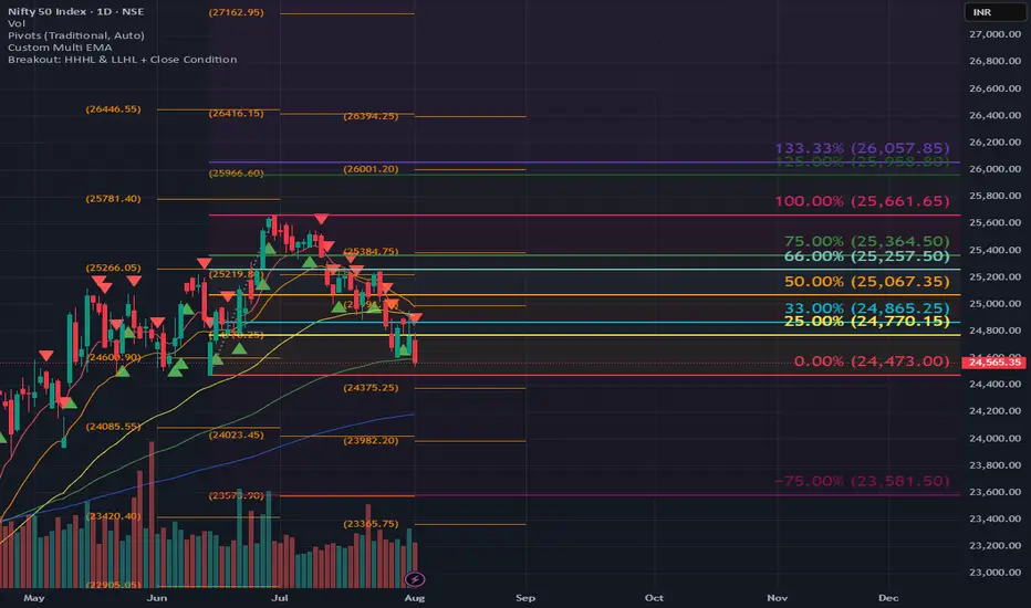 Red triangle above the bar = Bearish breakdown (Lower High + Lower Low + Close < Previous Low)