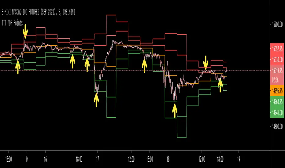 “TTT ADR Points” has been generated utilizing the fundamental methodology of ‘Pivot Points’ and ‘ADR (Average Daily Range)’. Numerous experiments and back/forward tests has validated that the trading spots provided by this algorithm are quite endurable even when price momentum and volatility are high. Furthermore, traders are likely to close their position at their average entry price even when the market trend and price actions flow unexpectedly. This technical indicator is particularly useful for future commodities such as Nasdaq, Gold, and Crude Oil, rather than Bitcoin and crypto.