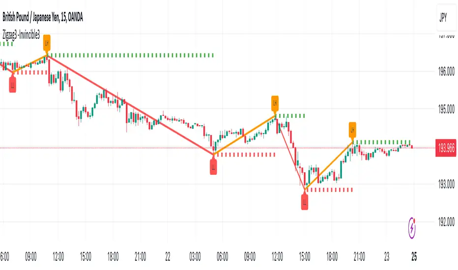 Zigzag3 - Invincible3 is a powerful and flexible support and resistance indicator for TradingView. Utilizing an enhanced ZigZag algorithm and Dow Theory principles, it detects price pivots, higher highs (HH), lower highs (LH), higher lows (HL), and lower lows (LL). The indicator draws lines and labels to visualize these pivots, making it easier to identify market structure, trends, and potential reversal points.