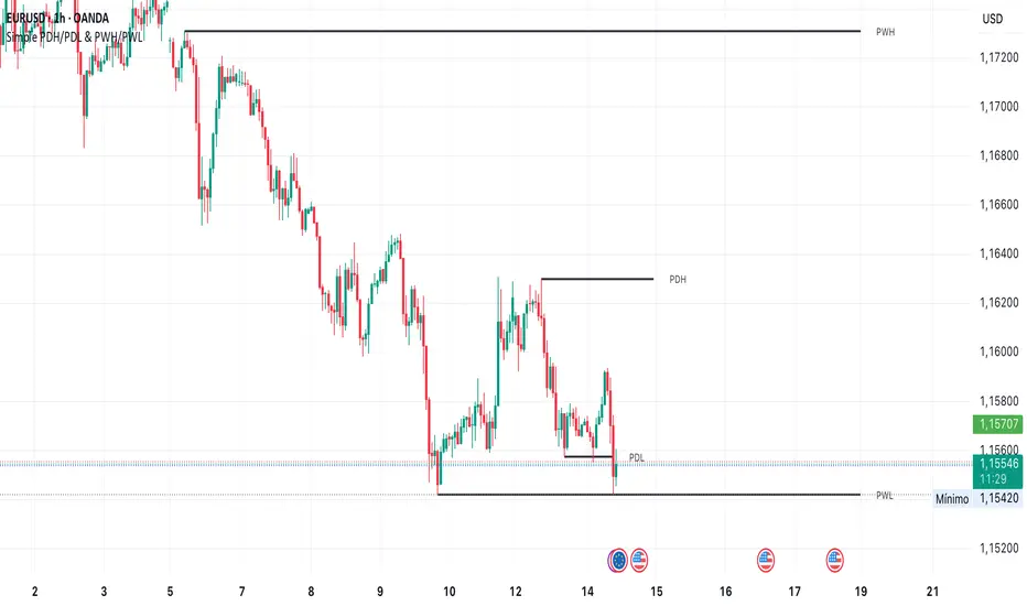 Summary:This indicator is designed to provide a precise and dynamic visualization of the most important price levels from the prior session: the Previous Day's High (PDH), Previous Day's Low (PDL), Previous Week's High (PWH), and Previous Week's Low (PWL). These levels are crucial as they often act as liquidity magnets, key support, or resistance.