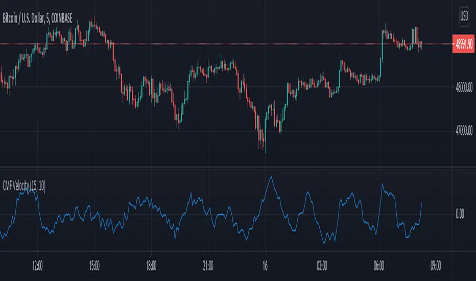 CMF Velocity informs the trader of the speed at which the CMF Indicator is changing. This allows the trader to anticipate reversals in price action. Buy and Sell signals are generated when the value crosses the zero-line. This indicator is best used in combination with another indicator (Stochastic, MACD), although it does work quite nicely by itself. The default values work adequately, but some tuning may be needed for best results.