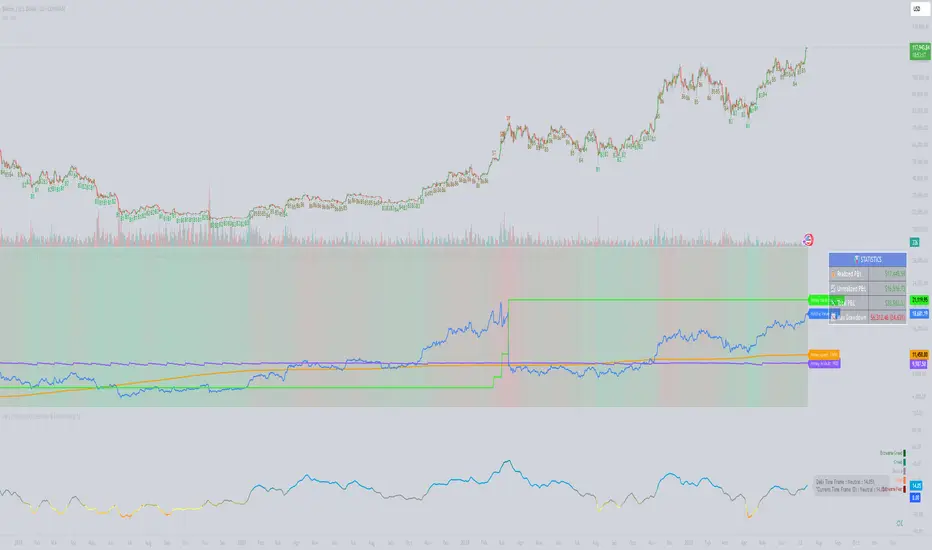 The strategy uses buy multipliers to control position sizing. At lower risk levels (e.g., 0.1), higher multipliers (4x) enable larger purchases. As risk increases (e.g., 0.7), reduced multipliers (1x) limit market exposure, creating a dynamic DCA strategy that adapts to market conditions.