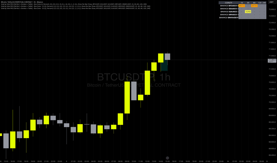 Side by Side PRO (Perfect + Broken + Table) - Box Zone English (simple & clear) Side by Side PRO spots price clusters where candles close at similar levels. It draws a zone box on the chart and signals when price breaks out. A table shows the same view across multiple timeframes for 5 coins. 🧭📦🔔 Highlights: Zone box on the chart 📦 Breakout signals up/down 🚀⬇️ 5 coins × 5 timeframes overview 🧭 Alerts for new zones & breakouts 🔔 Penunjuk Pine Script®oleh caspa_1233211