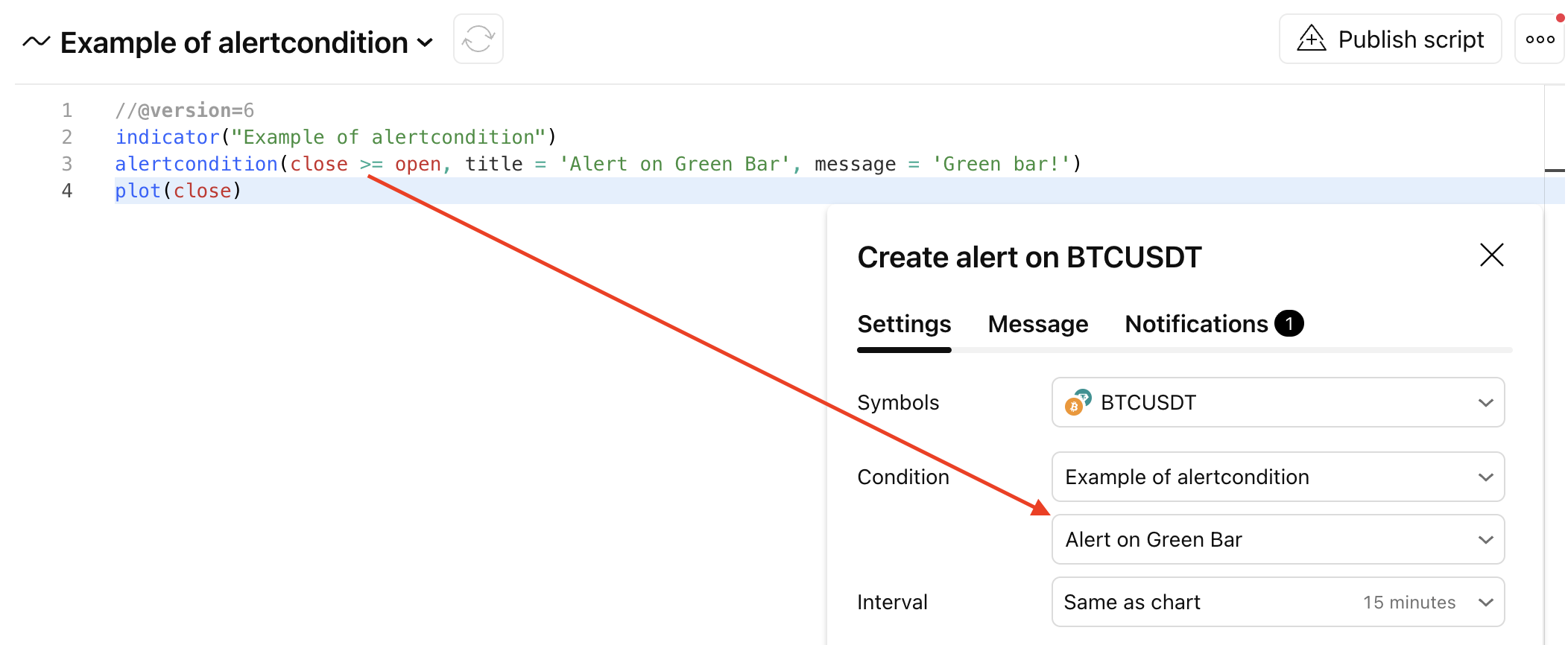 alertcondition(condition, title, message)Jika keadaan menjadi benar, pemberitahuan akan tercetus. Untuk mencipta satu pemberitahuan berdasarkan alertcondition, gunakan satu kod Pine dengan alertcondition kepada carta terkini, buka dialog Cipta Pemberitahuan, pilih kod Pine yang diaplikasi sebagai keadaan utama untuk pemberitahuan dan pilih pemberitahuan tertentu dengan tajuk yang anda sampaikan sebagai satu argumen kepada fungsi alertcondition.