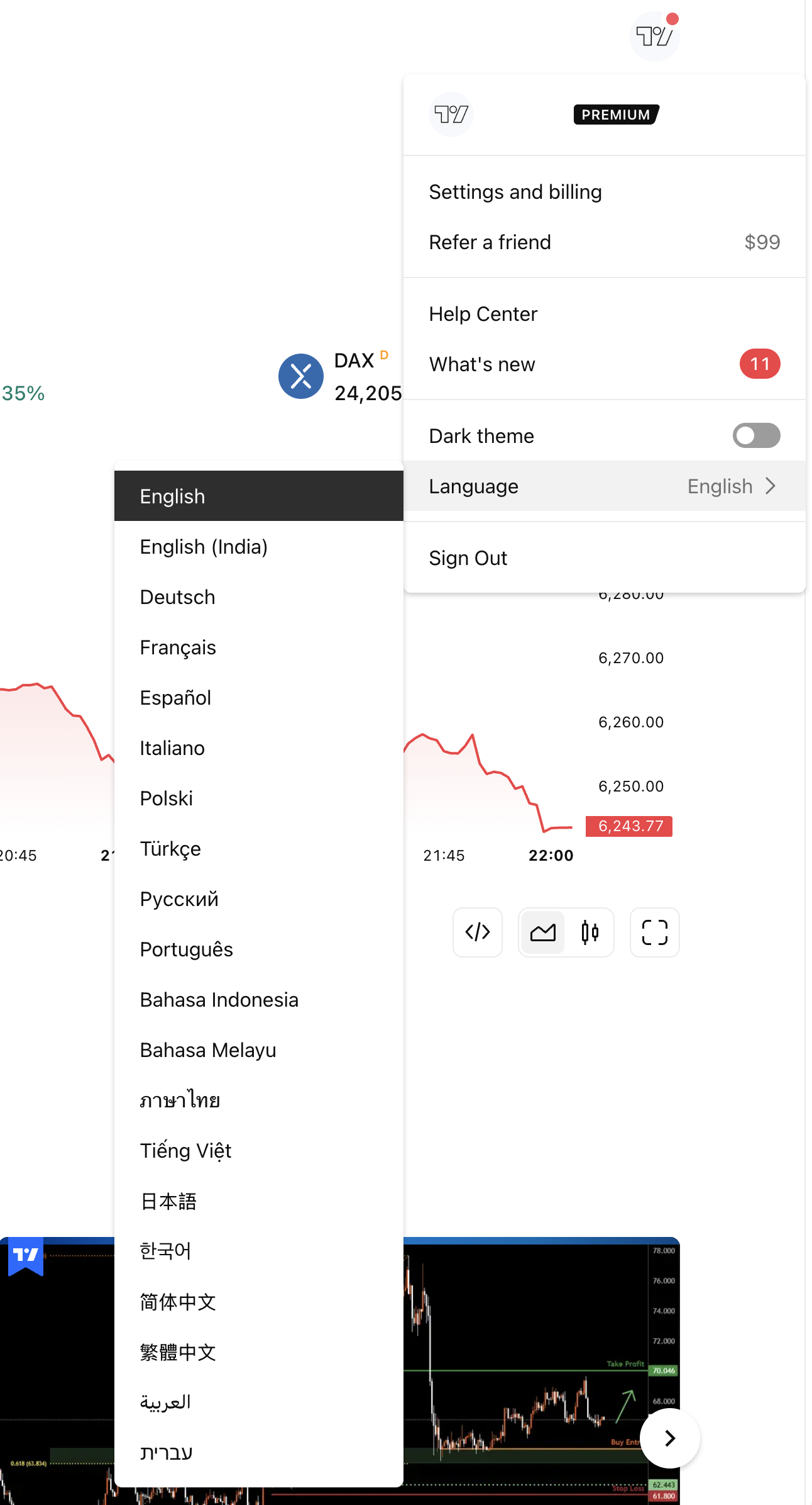Anda boleh bertukar antara versi bahasa (tempatan) TradingView di menu pengguna.