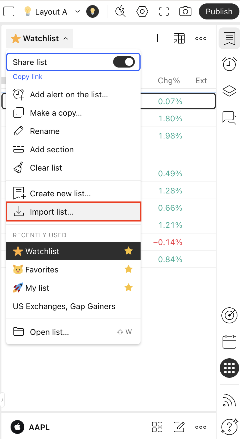 Untuk mengeksport senarai amatan, klik pada nama senarai amatan pada bar alat kanan dan pilih fungsi "Import senarai..." dari menu.