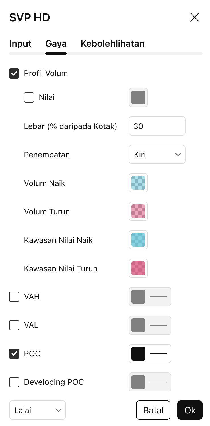 Nota: anda boleh membaca lebih banyak mengenai ciri yang dikongsi oleh semua penunjuk Profil Volum dalam artikel Pusat Bantuan Konsep Asas: Penunjuk Profil Volum. Teks di bawah menjelaskan ciri-ciri unik kepada penunjuk Profil Volum ini.