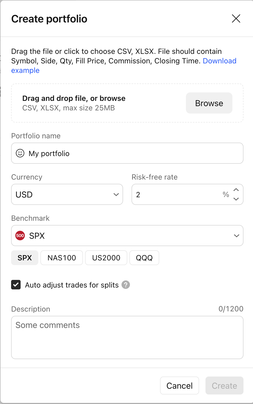 Selepas mengklik, satu tetingkap pop keluar akan dibuka dengan tetapan untuk portfolio baharu dan pilihan untuk memuat naik fail CSV dengan transaksi.
